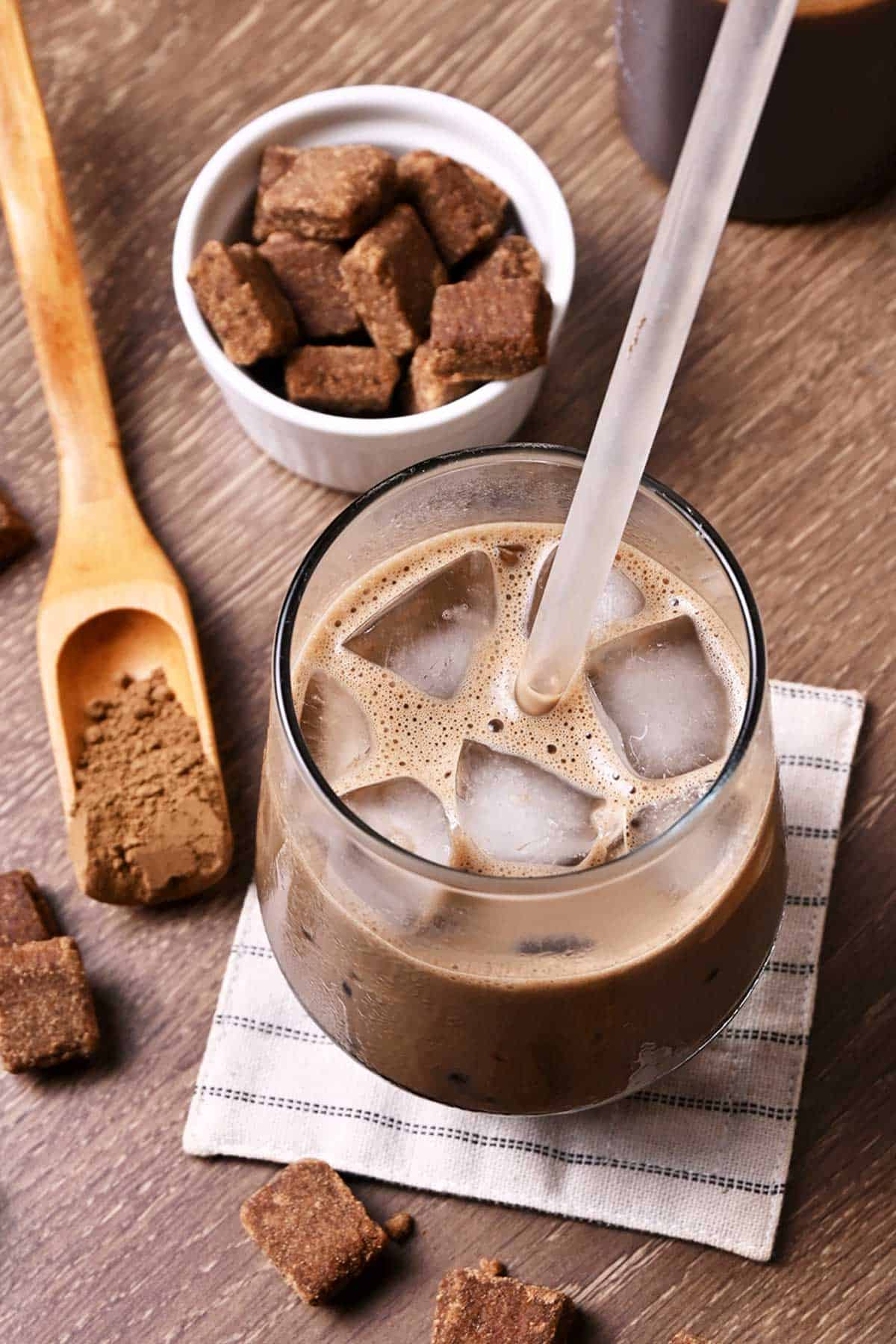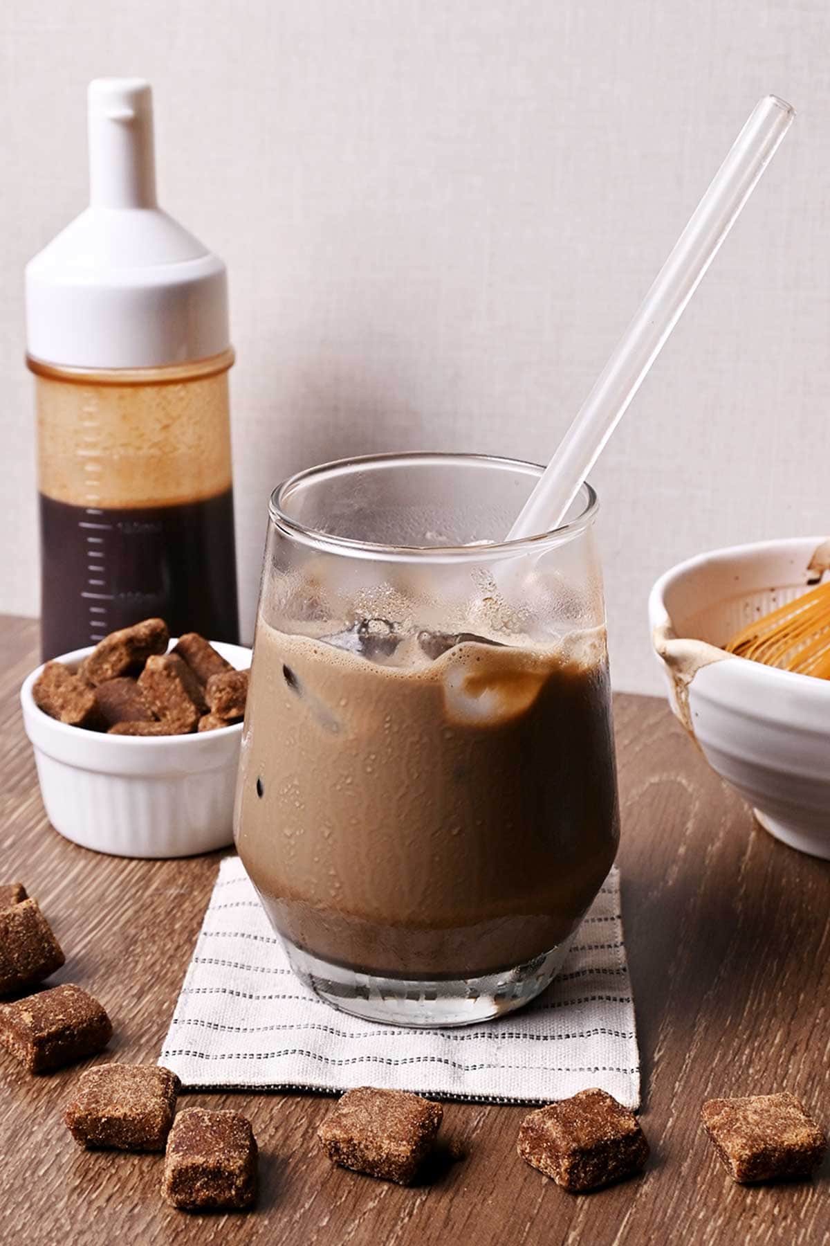 - Drizzle kuromitsu over the sides of the serving glass. Add ice cubes and milk, followed by the hojicha mixture. Enjoy!