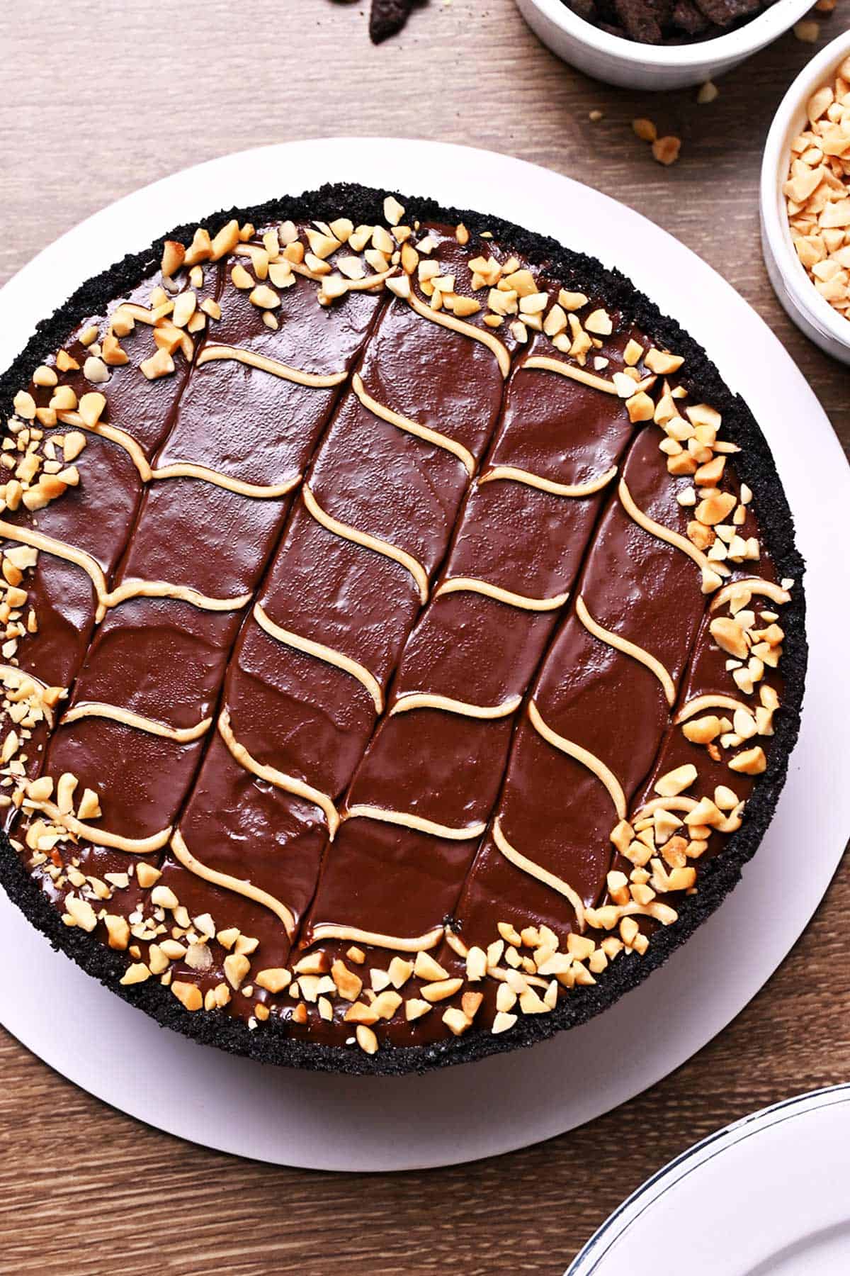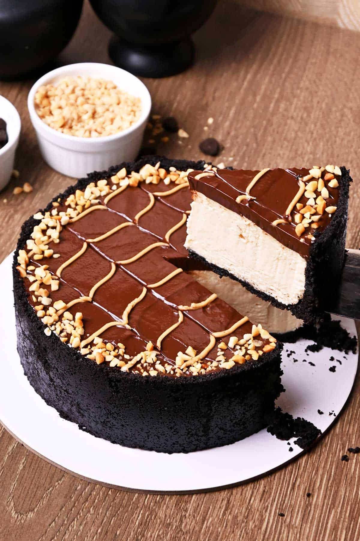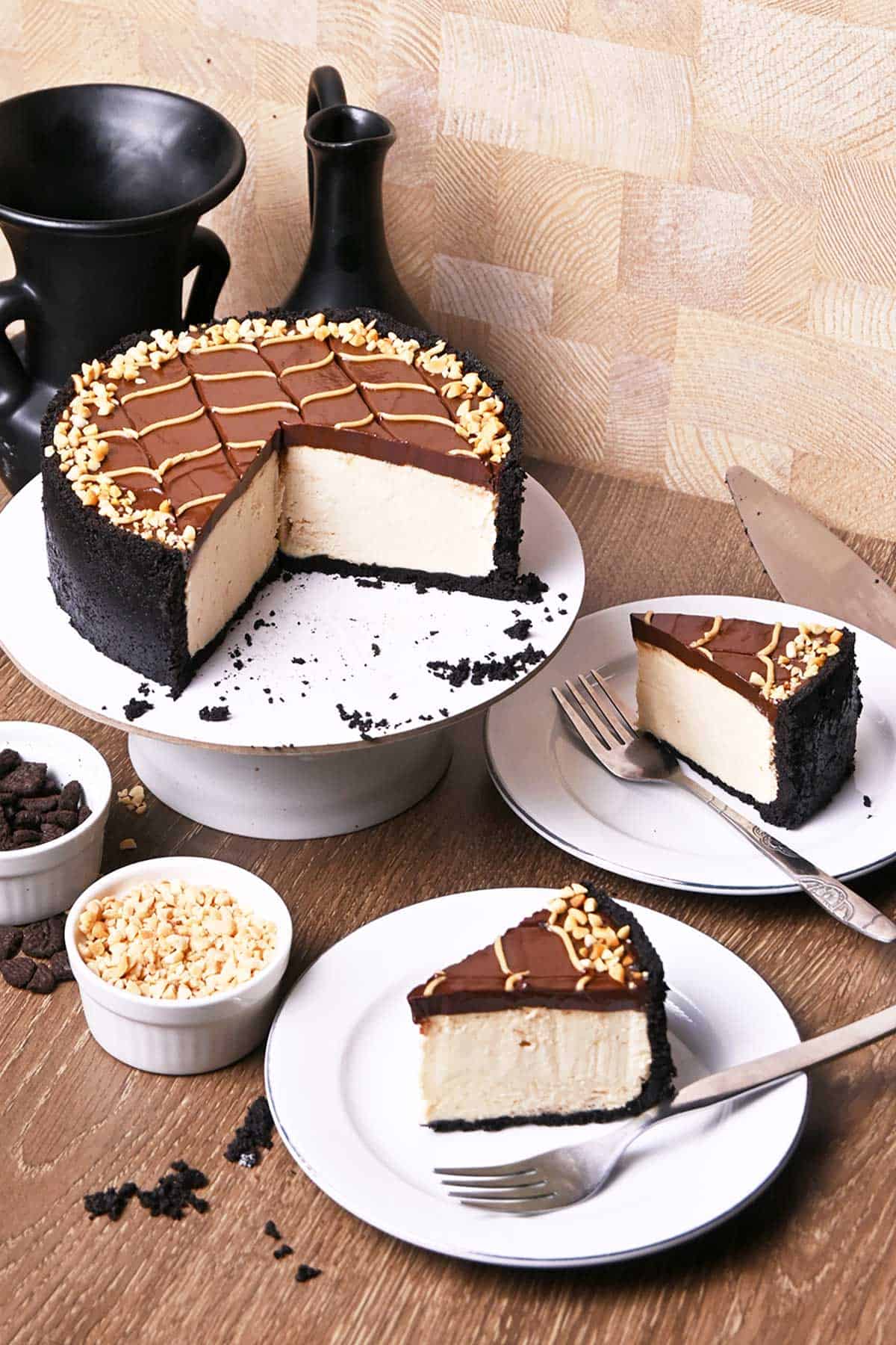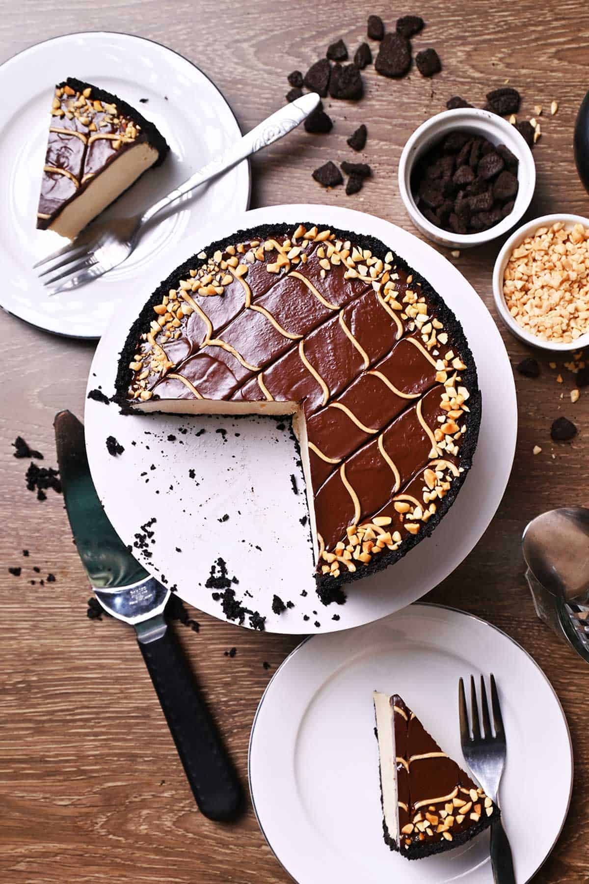 This version has a crunchy Oreo crust and decadent chocolate ganache topping sandwiched around a smooth, creamy peanut butter cheesecake filling. And did I mention it is a no-bake cheesecake!? It only needs a few hours in the fridge to set up.