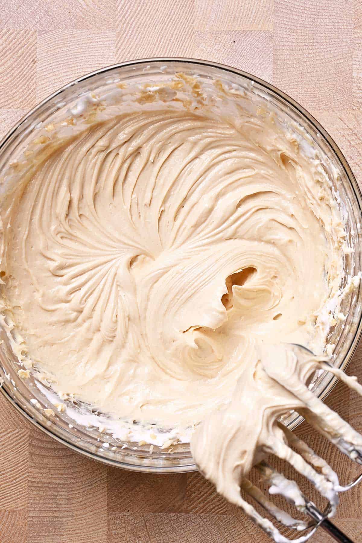 - In a separate bowl, whisk the heavy whipping cream until soft peaks form. Add the whipped cream to the cream cheese mixture. Mix on low speed with your mixer just until well combined.