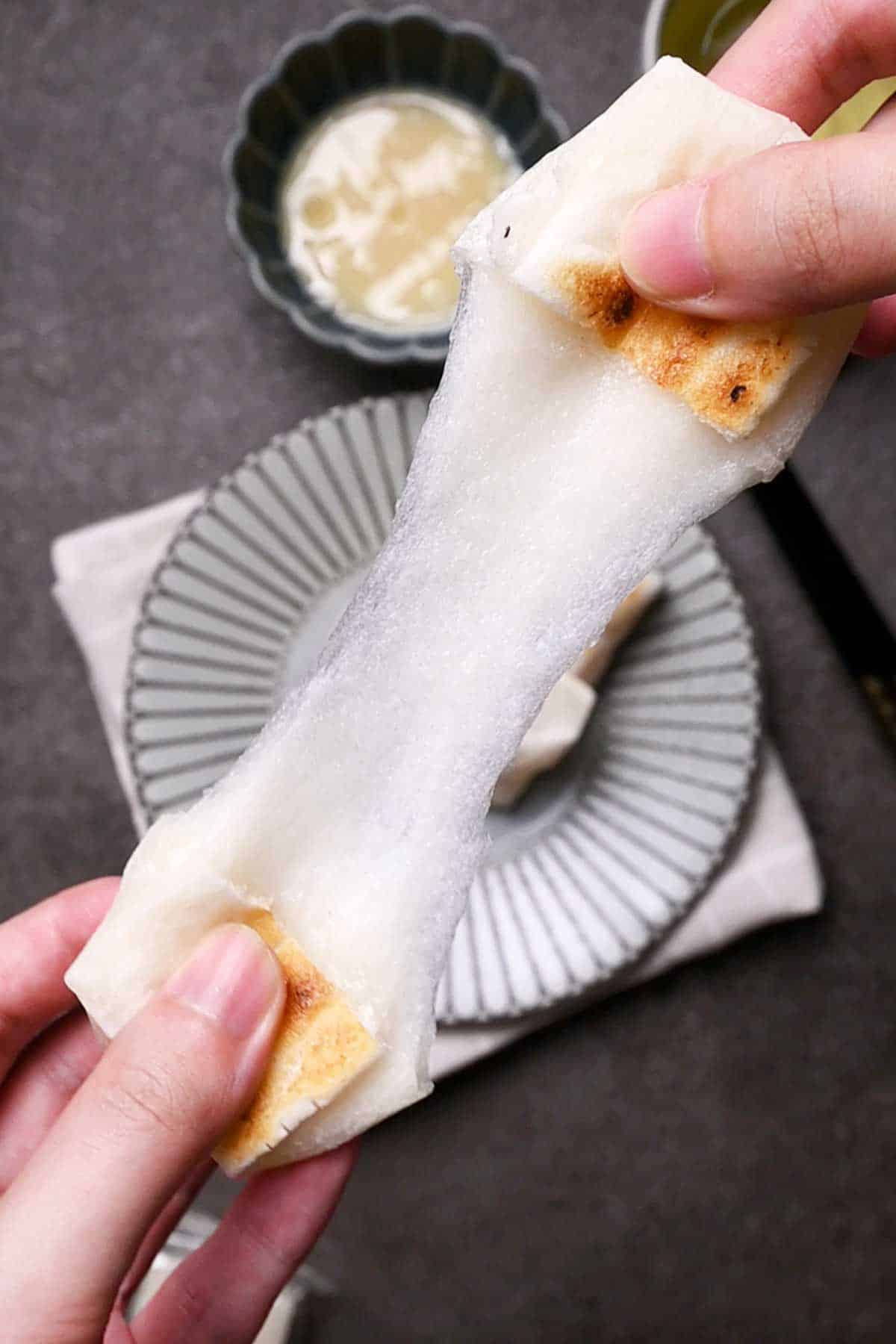 One preparation method I love for cooking kiri mochi is by grilling it. Yaki Mochi or grilled mochi is traditionally grilled over charcoal, but it can now be toasted in the oven, toaster, air fryer, or over the stovetop. You’ll know it’s ready when the outside gets a little golden and toasted and the mochi puffs up.